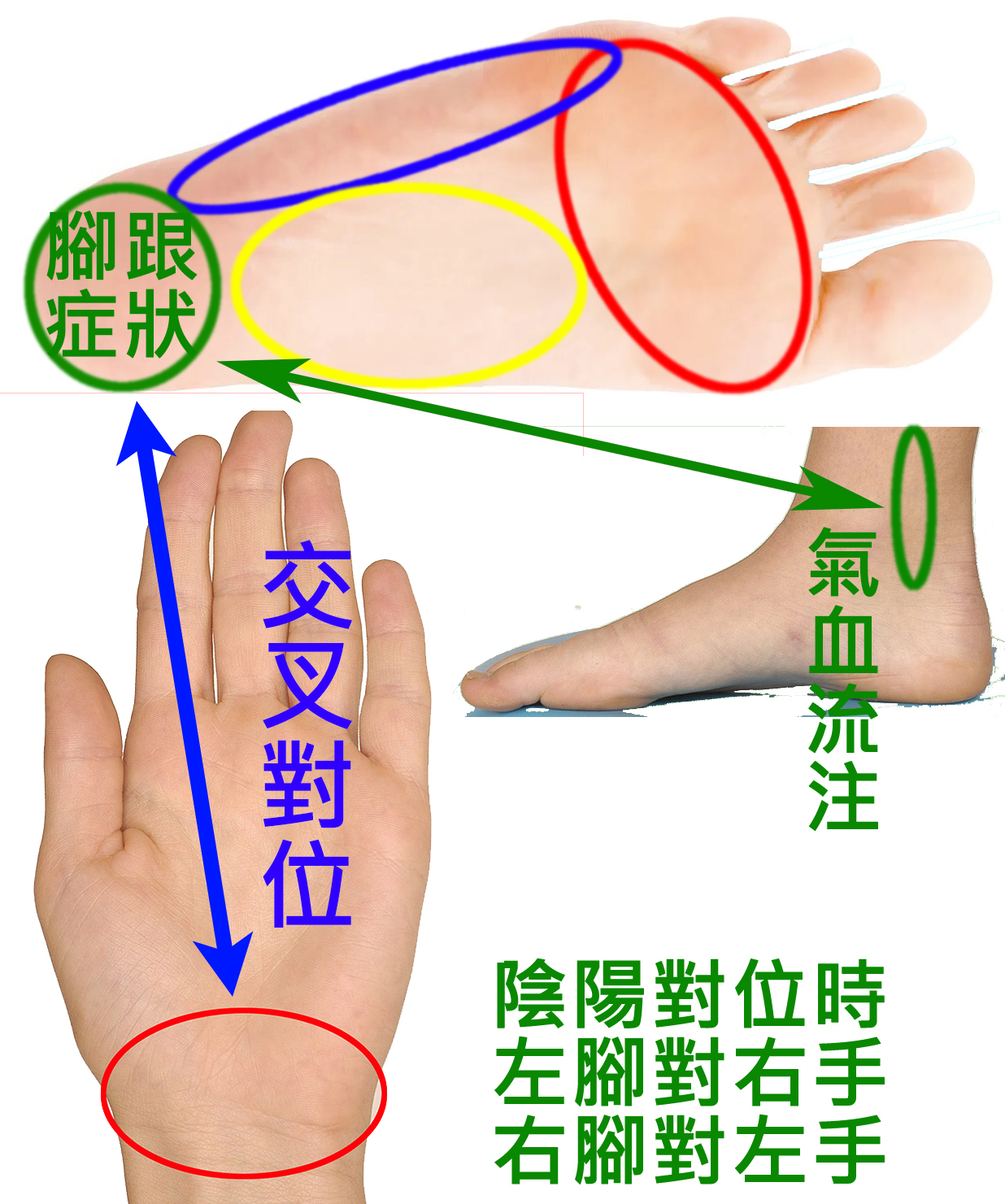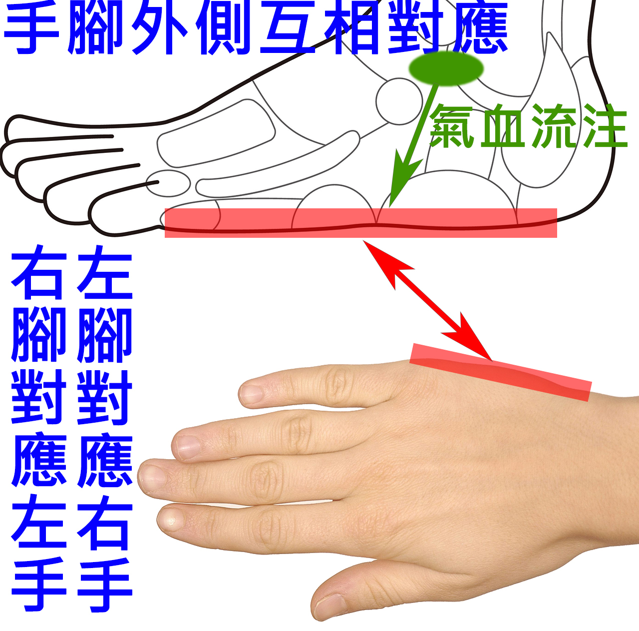 ① 陰陽對位:四疊拍拍腳背對應手的外緣位置;