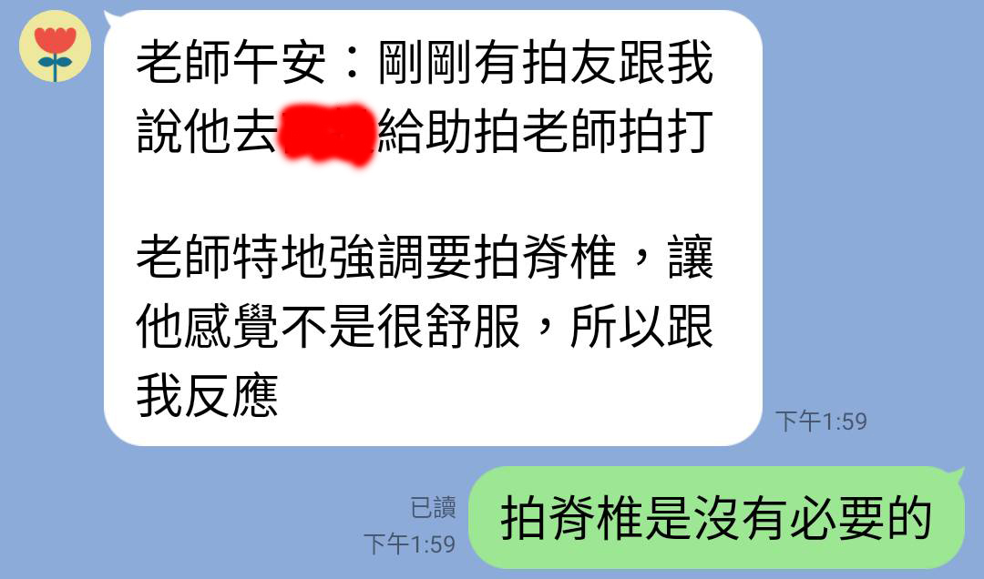 ③ 讓受拍者充份的了解三分治、七分養,健康主要是受拍者自已的事,受拍者自已需要全盤掌握健康的所有步驟,助拍老師僅是從旁協助者的角色。