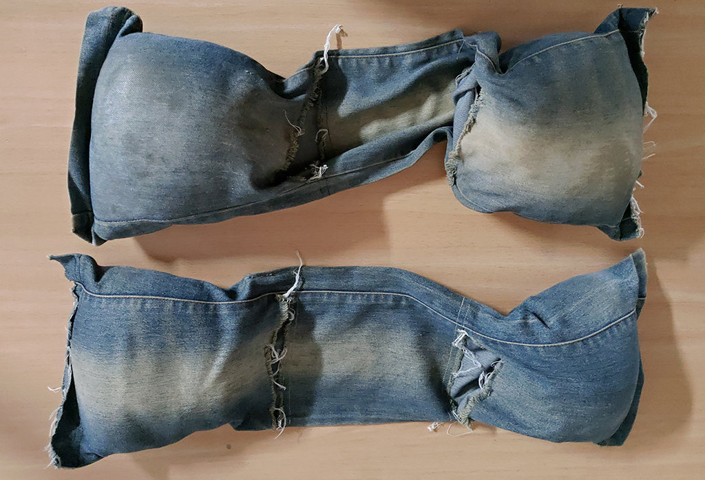 沙袋請用牛仔褲來做,用其他的布料容易破。做法如下:
