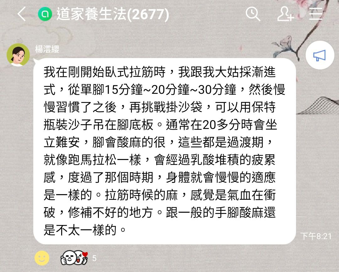 ⑤拉筋時要先著重在延長拉筋時間,不是在壓沙袋,壓沙袋是在一隻腳能超過25-30分鐘後才加壓上,因為拉筋時間不夠的話,氣發揮不了多大的作用。