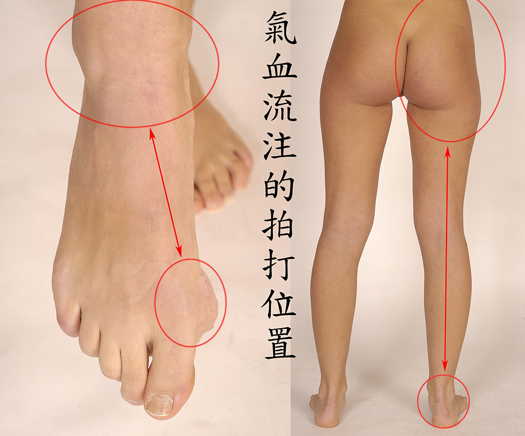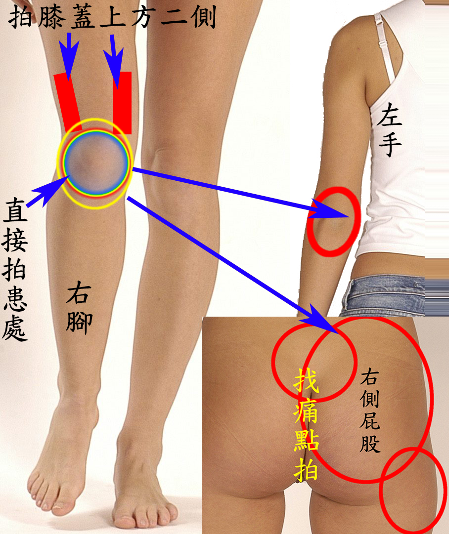 ※ 拍右腳腳踝的四週和右側屁股的尾椎,環跳,大轉子,薦椎位置。