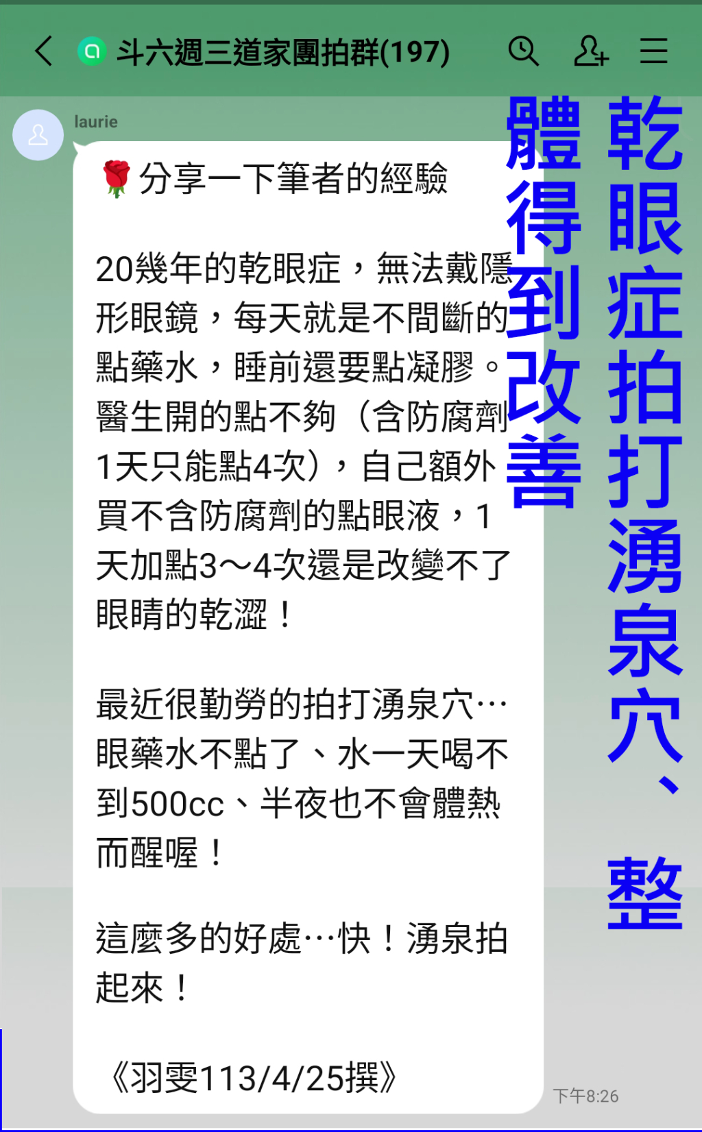 眼睛乾不舒服的情形,代表體內的水份不足; 這種體內水份不足的情形,不是喝水可以解決的,要多加強拍後背 + 委中 + 湧泉 + 拍頭! 清三焦的瘀堵,通暢,對眼睛乾的情形,有加份;