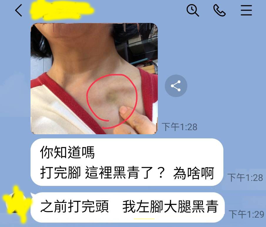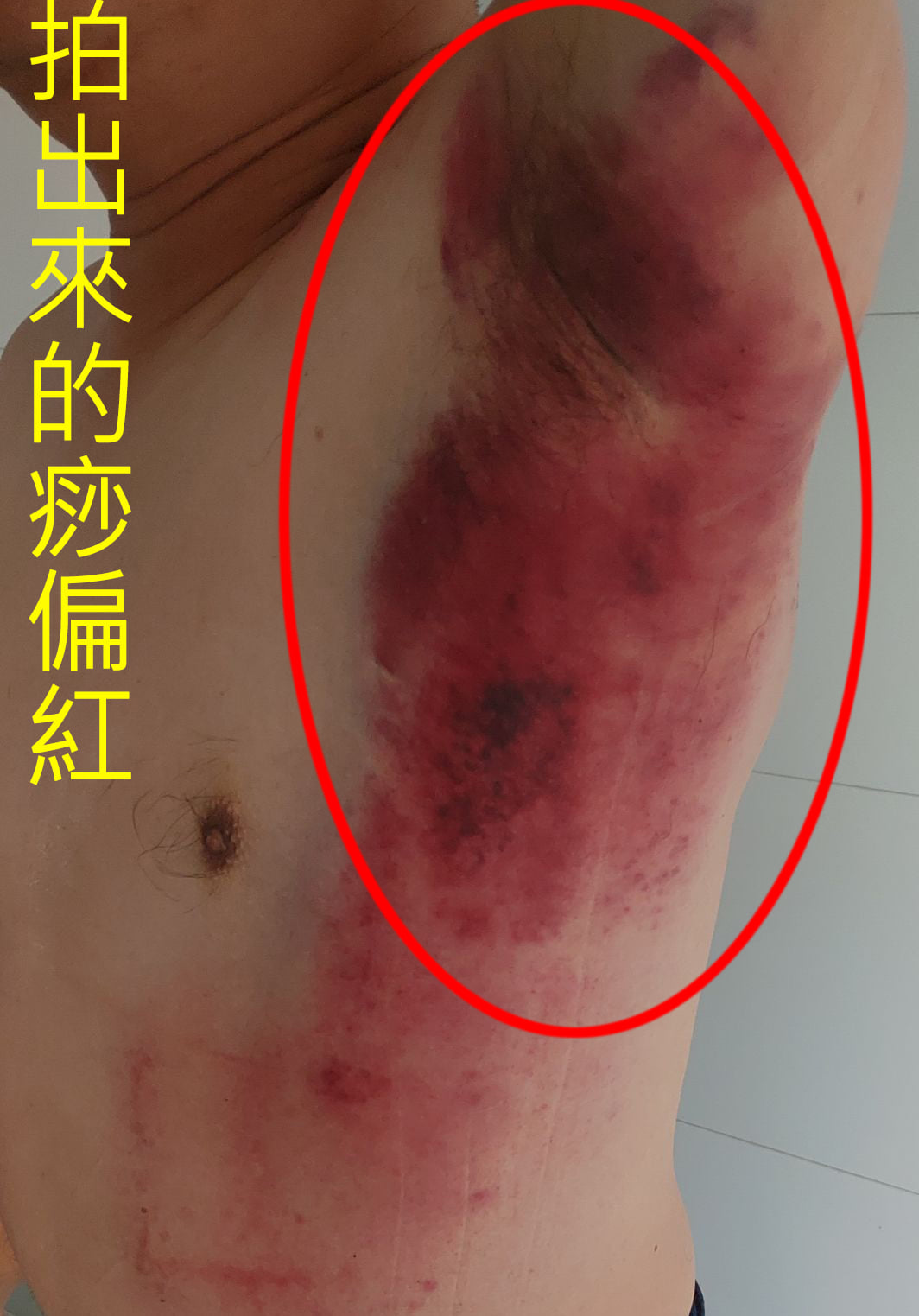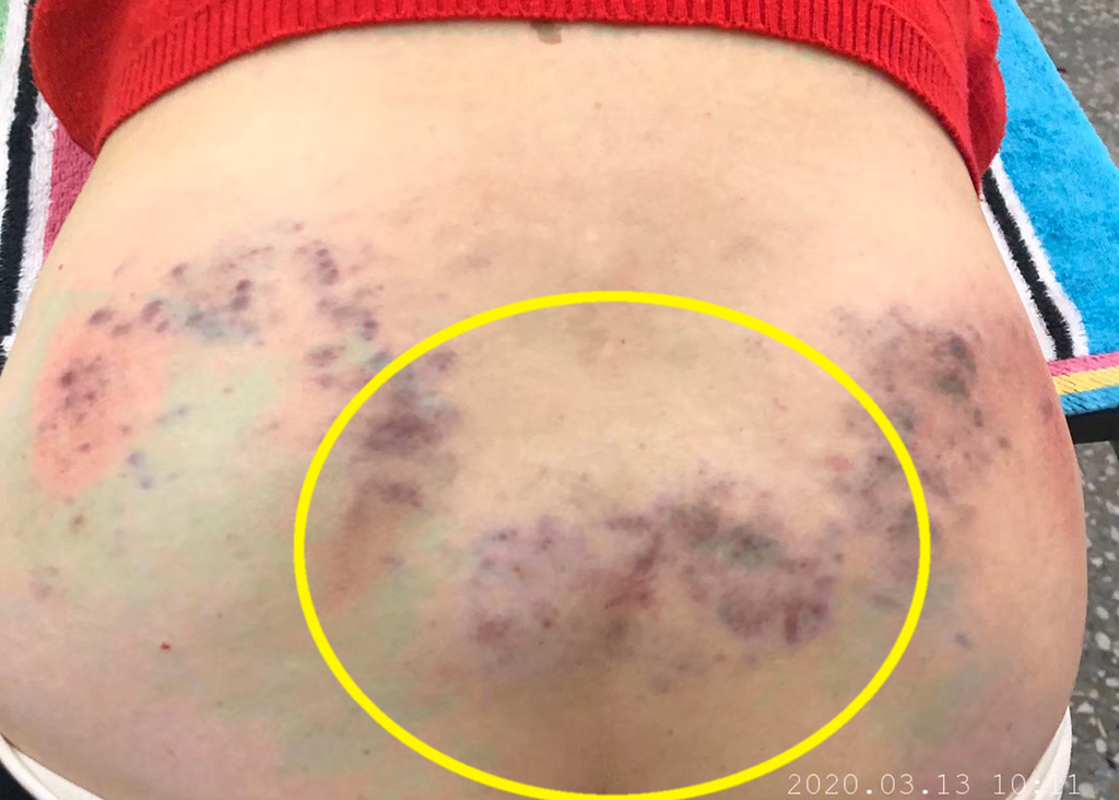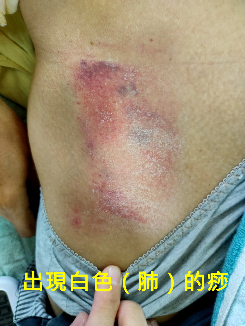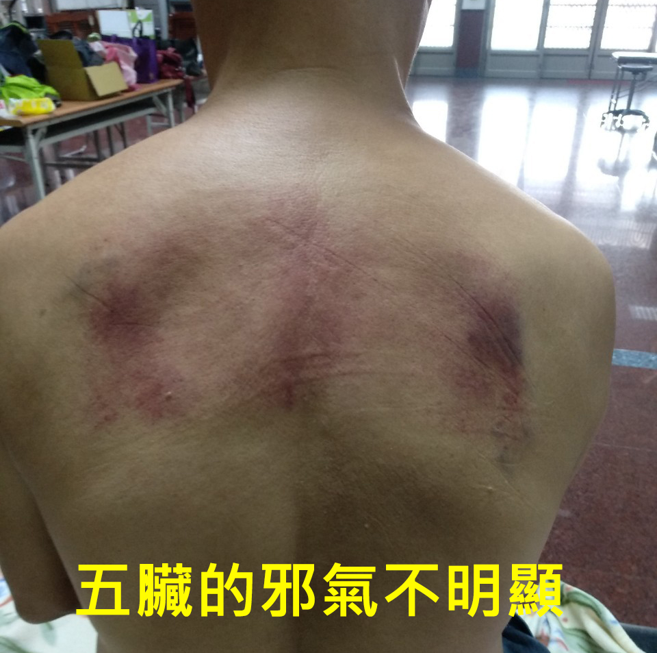 拍打後的出痧情形,看起來就好像是皮下出血一樣;