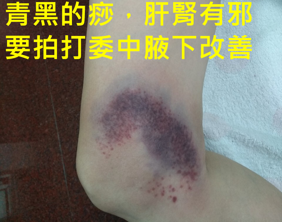 偏黑的痧,腎膀胱的經絡要清瘀,急的時間拍8虛的委中改善