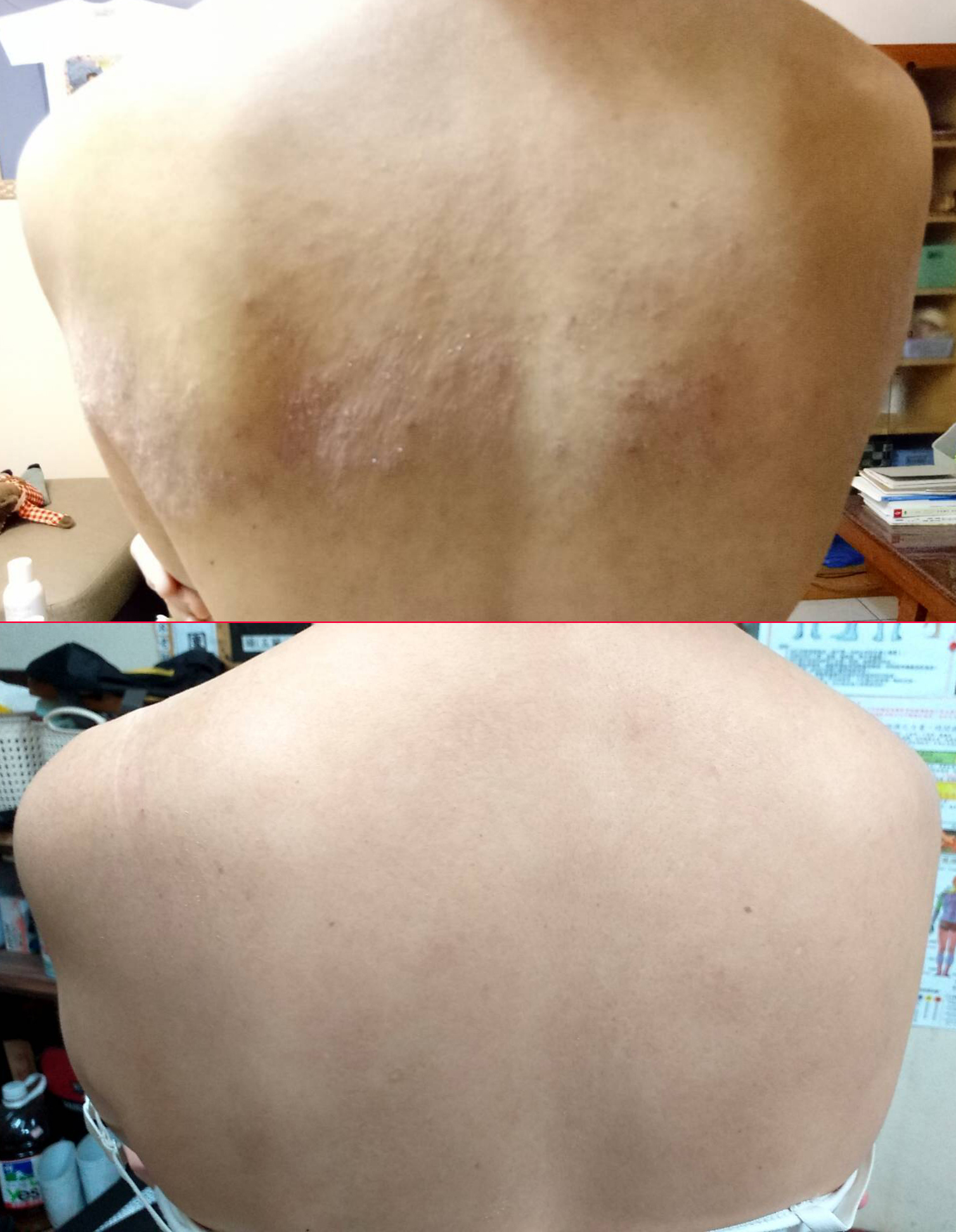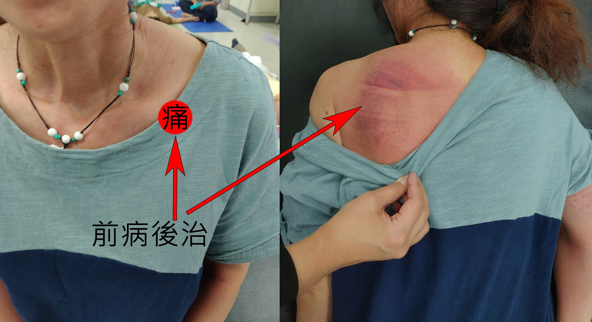 數十年前在遊樂場,前胸受到挫傷,拍正後方的背脊處改善;