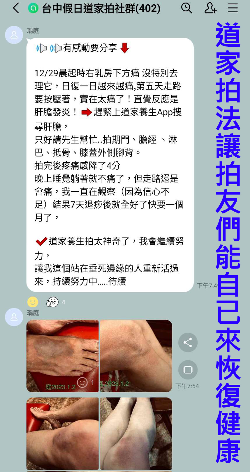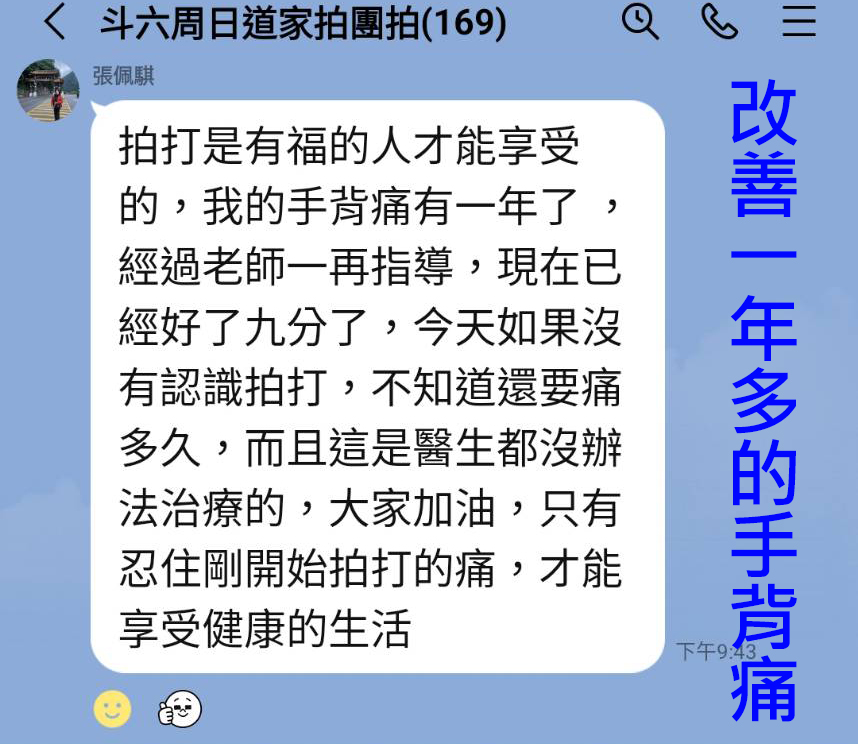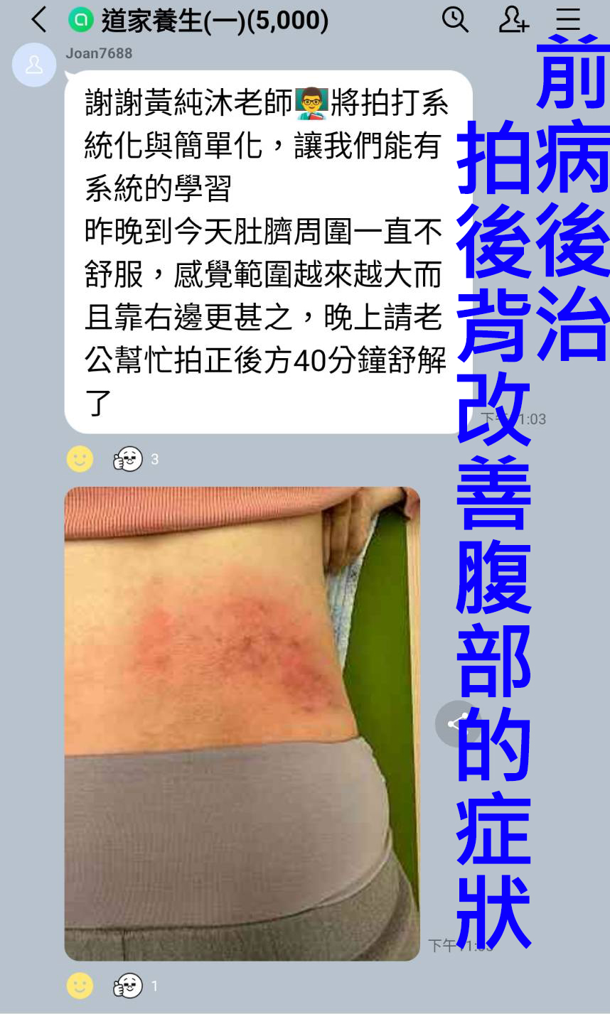 改善多年前汽車安全氣囊的舊傷:用四疊拍以前病後治的方式,後背的對應位置,拍打的時間,可以拍久一點,能拍到大力拍都不痛的程度最好。