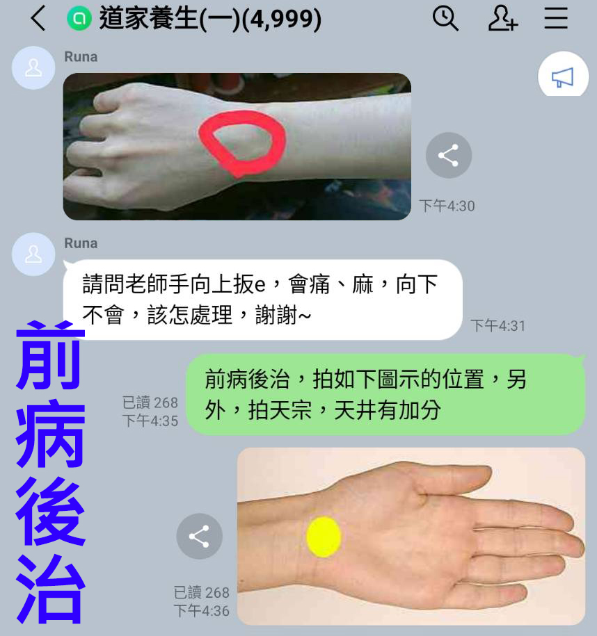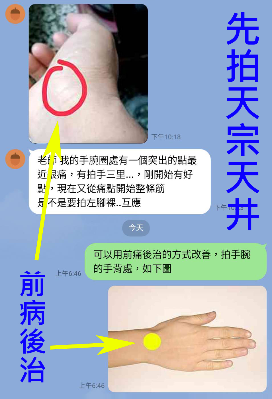 可以先拍天宗,天井後,再以前病後治的方式,拍手背對應處改善。