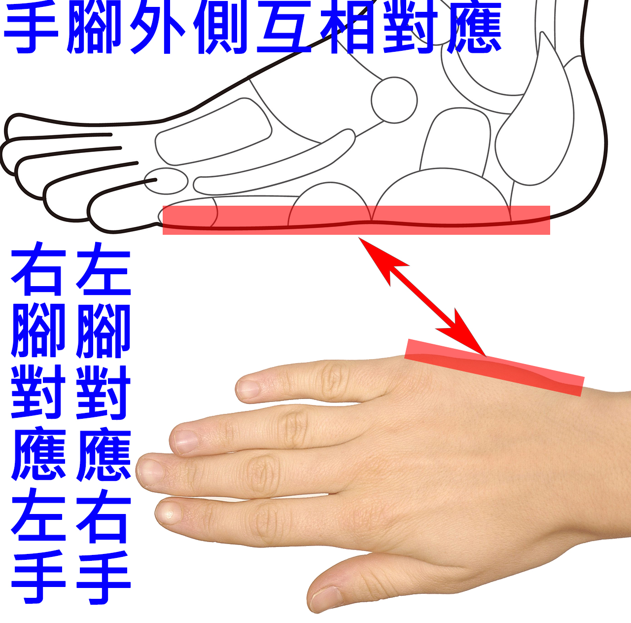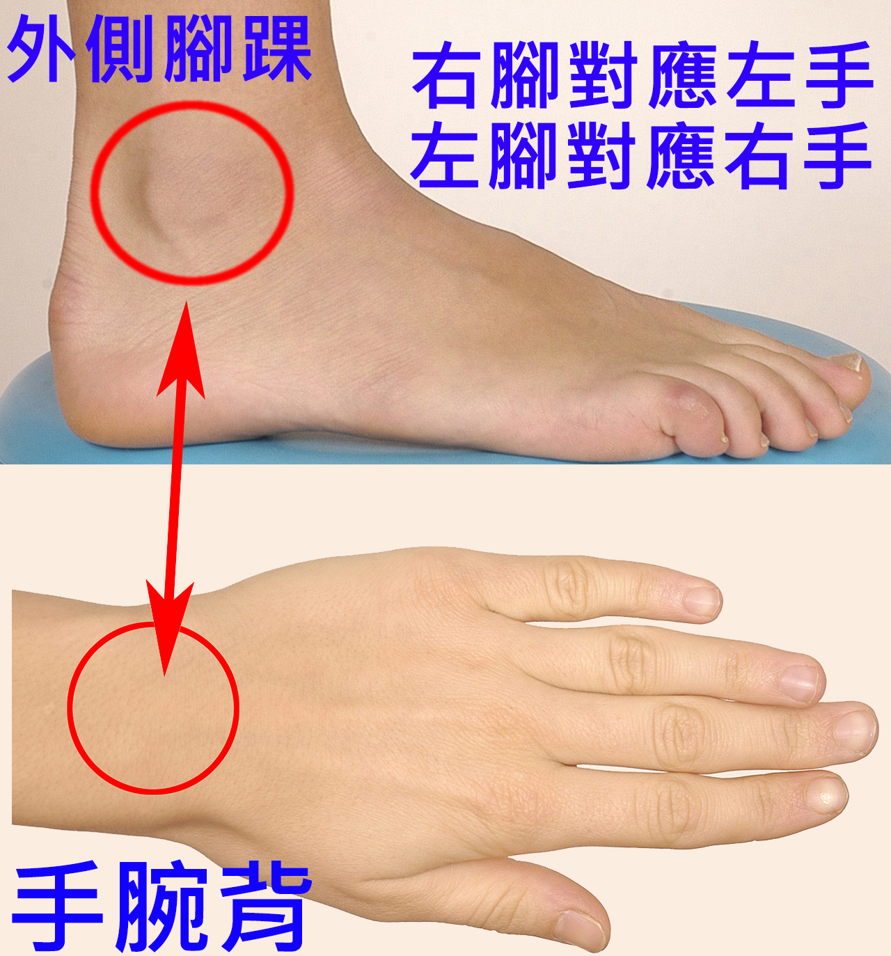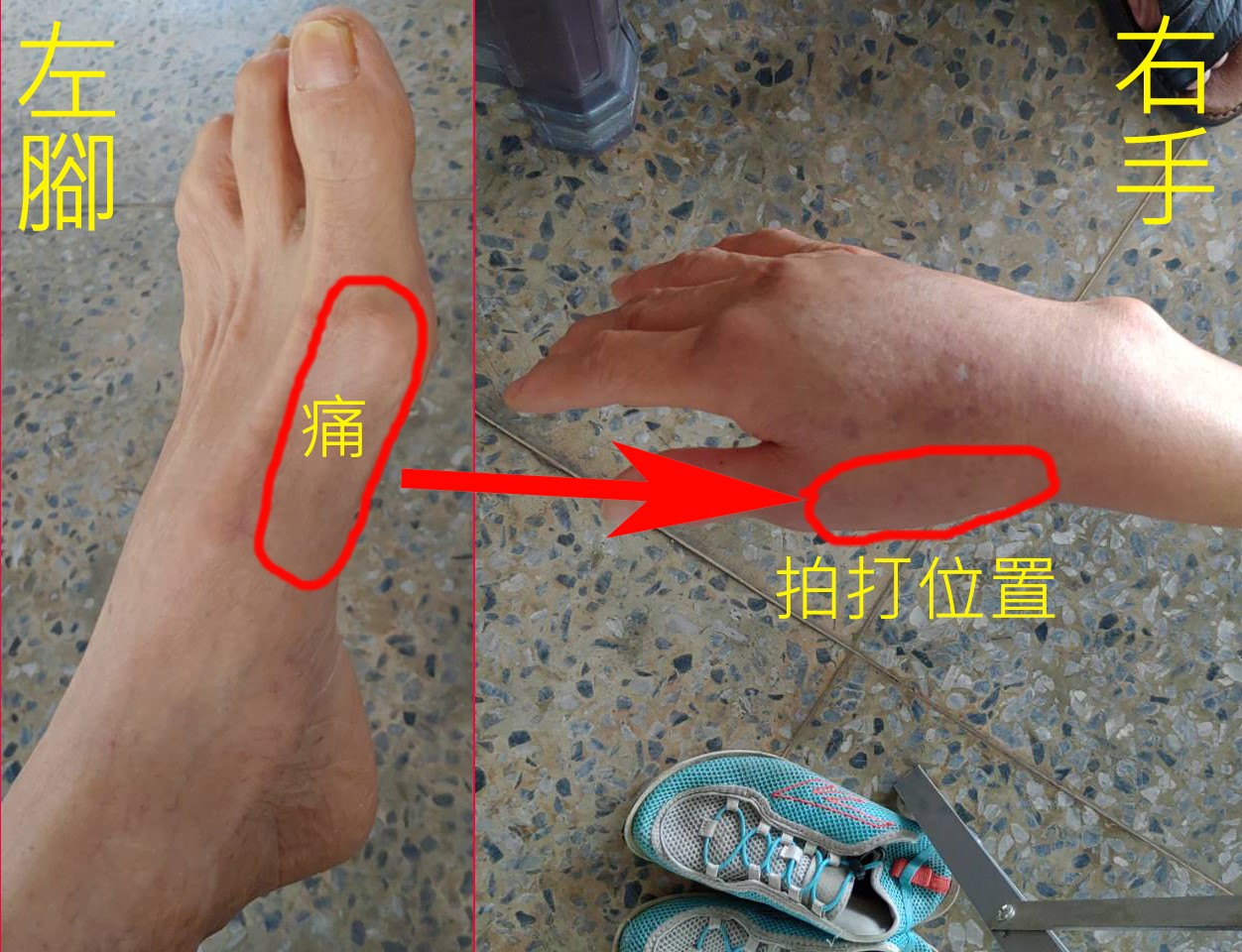 腳背有不適的情形,拍對側手背對應的位置改善;