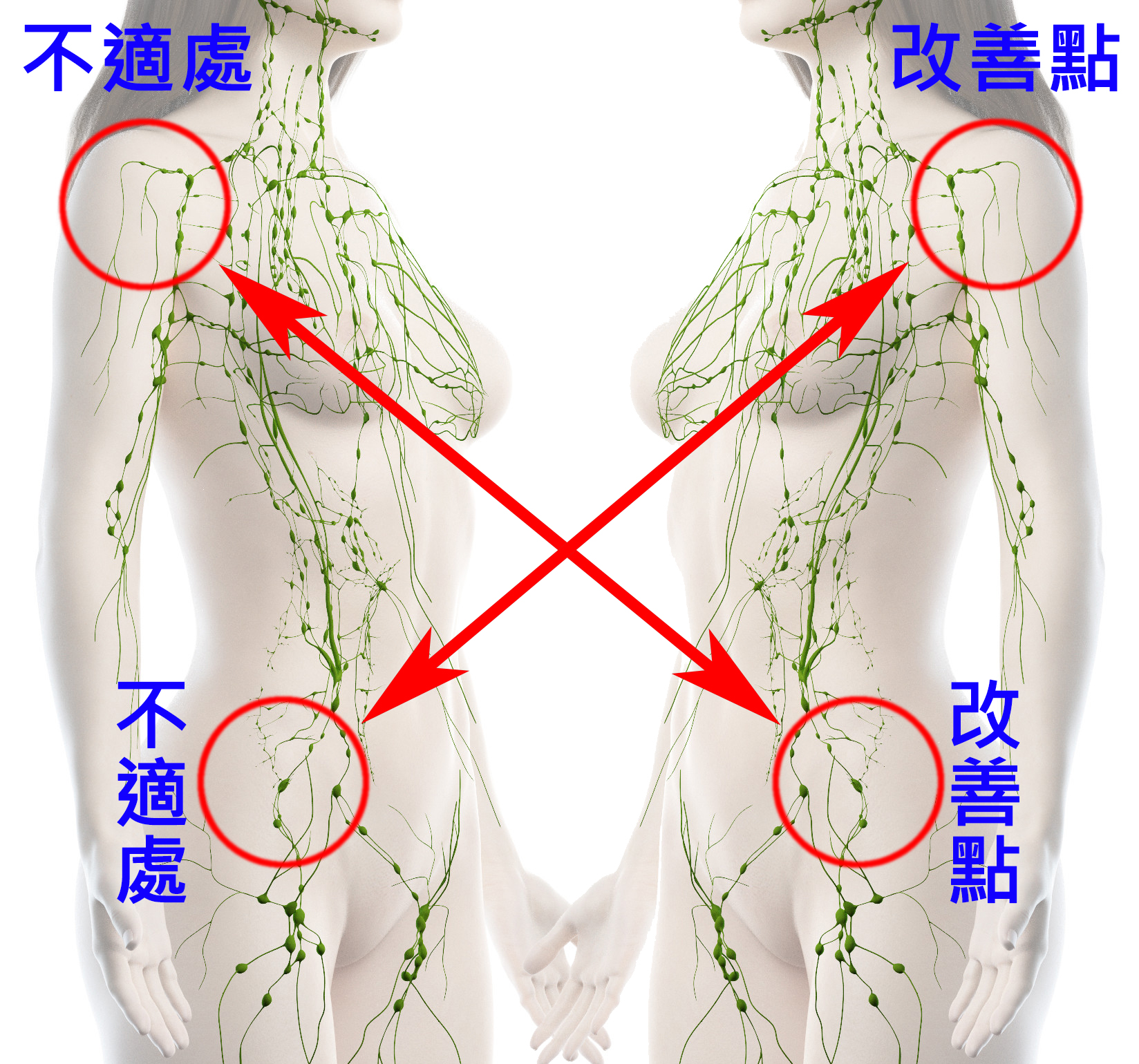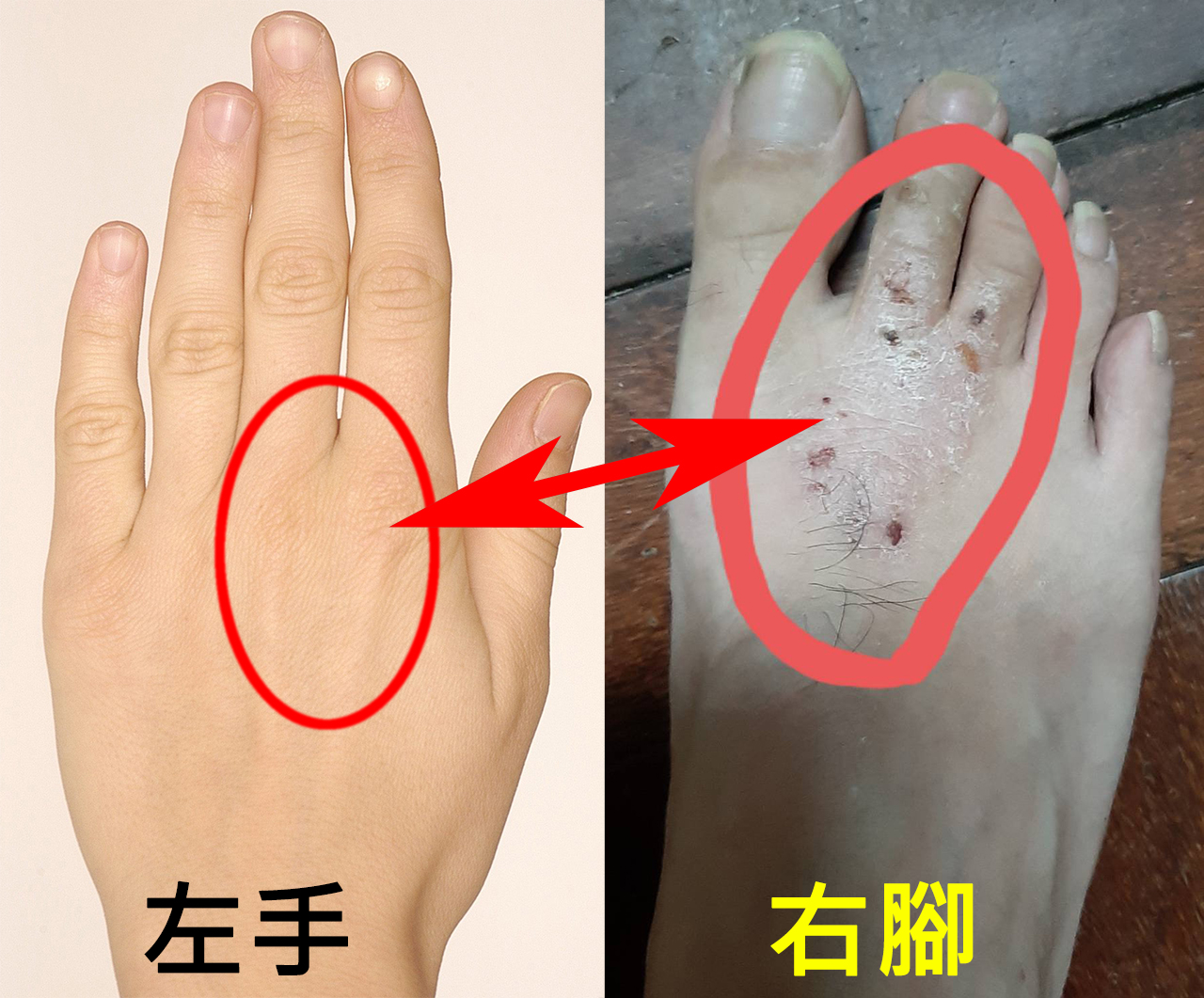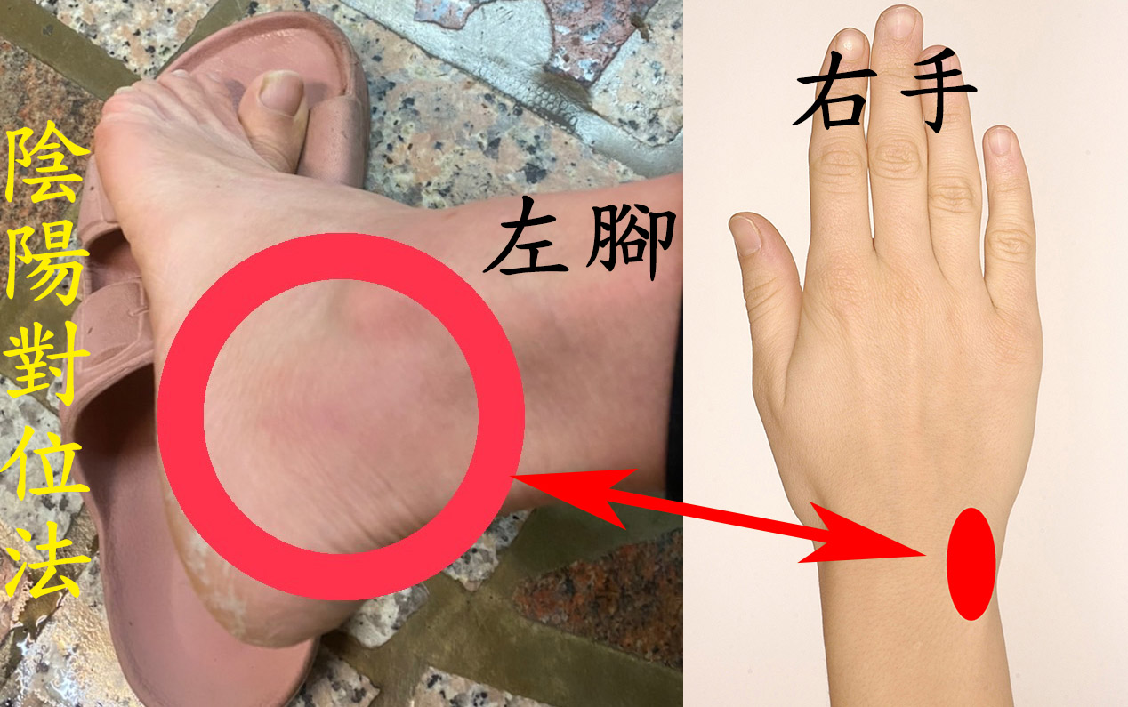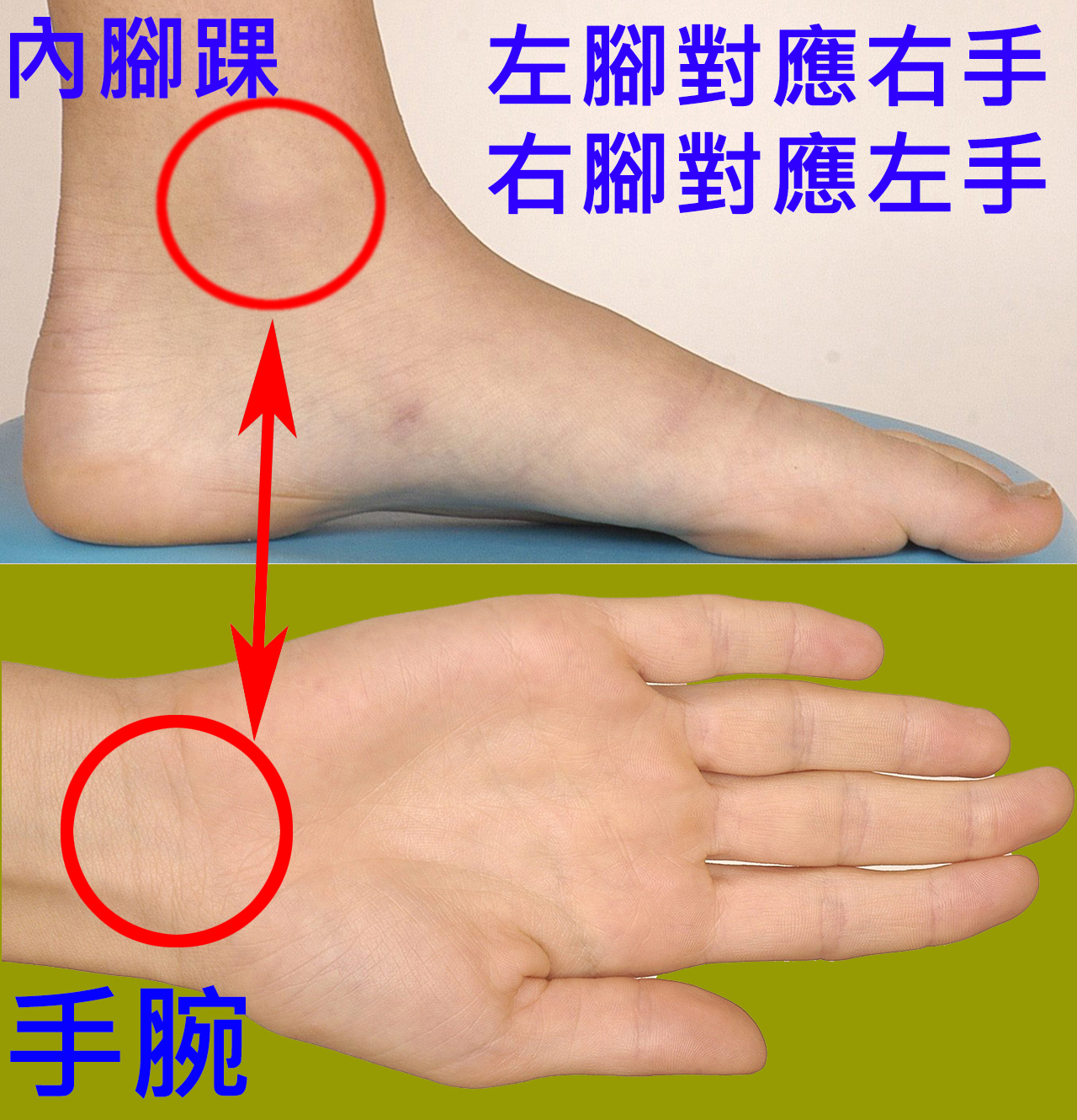 腳背有不適的情形,拍對側手背對應的位置改善;