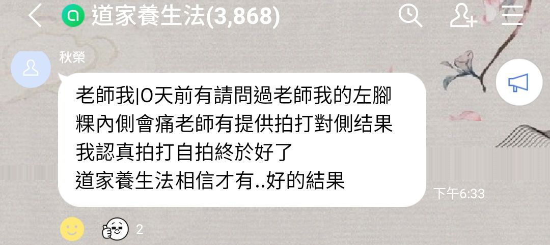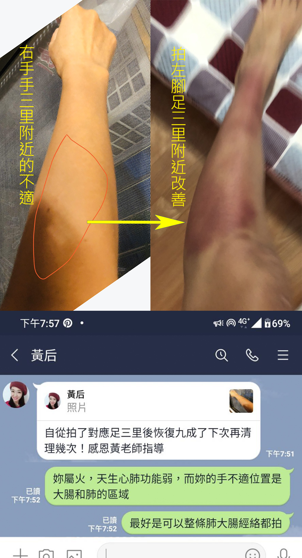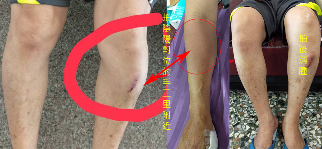 用道家拍法的三板斧改善,只拍了陰陽對位的右腳足三里,就改善了近九成;