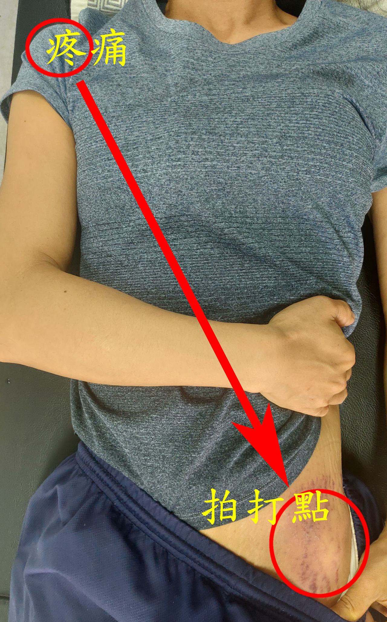 女,65歲:左大腿內側會抽痛,按道家拍法的三板斧,拍右手對應的位置搞定。