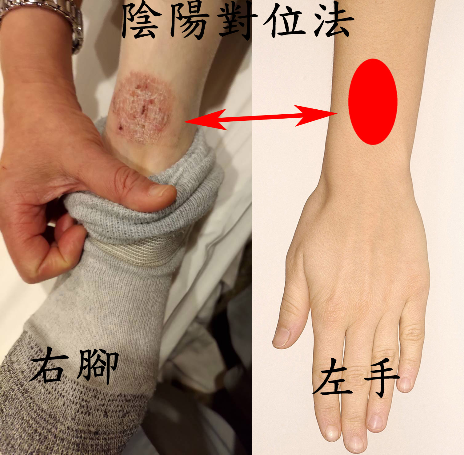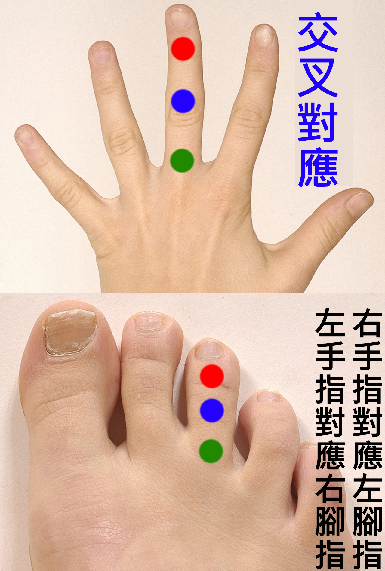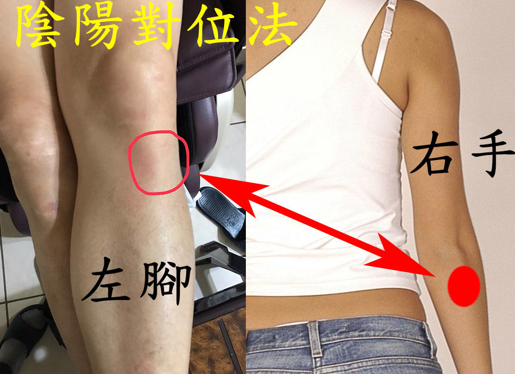 有某個特定的點,有不適的症狀時,可以使用陰陽對位的方式,效果也很不錯,在不適的對應點找痛點拍,如下圖: