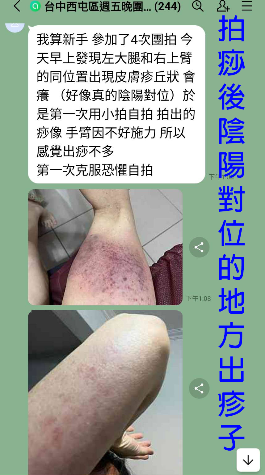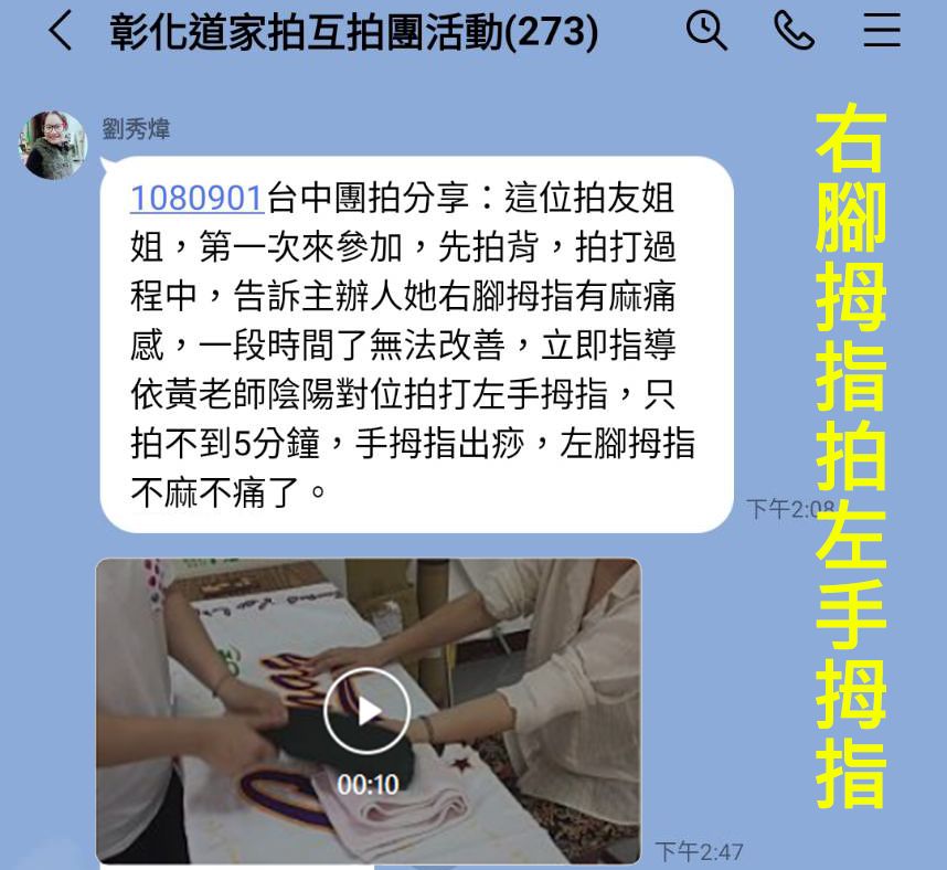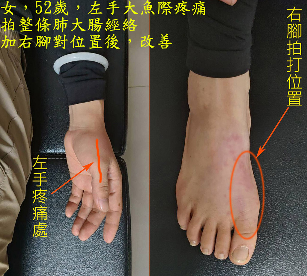 前幾天這位五十二歲的拍友,她左手的大魚際附近會酸痛,痛到影響睡眠,當拍了整條肺與大腸經和陰陽對位的右腳大拇指相關位置後改善了。