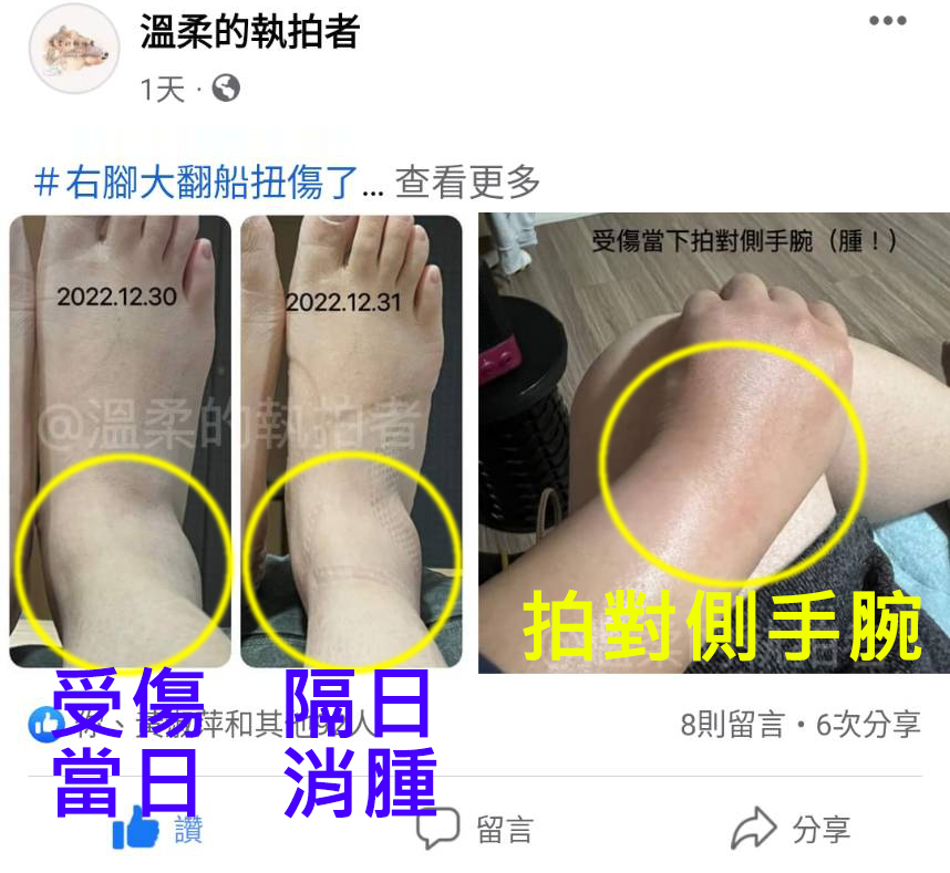 腳踝扭傷,拍對側的手腕的對應位置,隔天就消腫了。