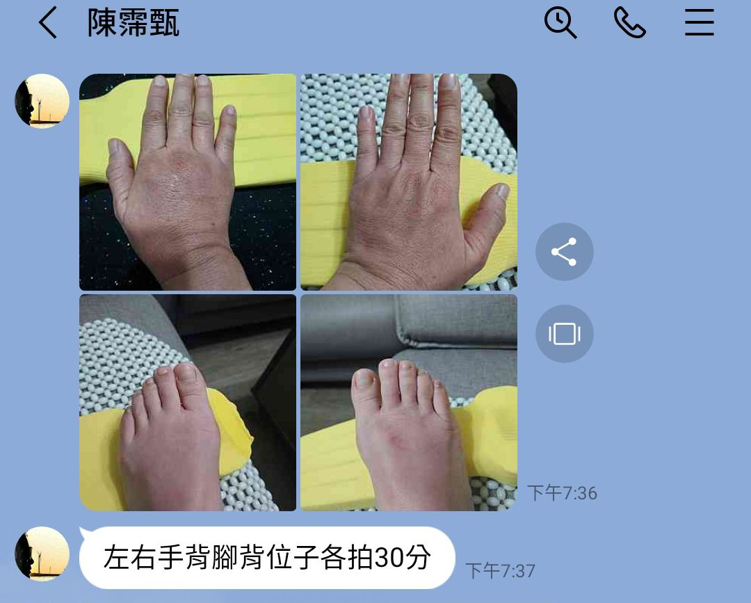 這位拍友拍腳背,花了30分鐘的時間,拍到大力拍都不痛的程度了;