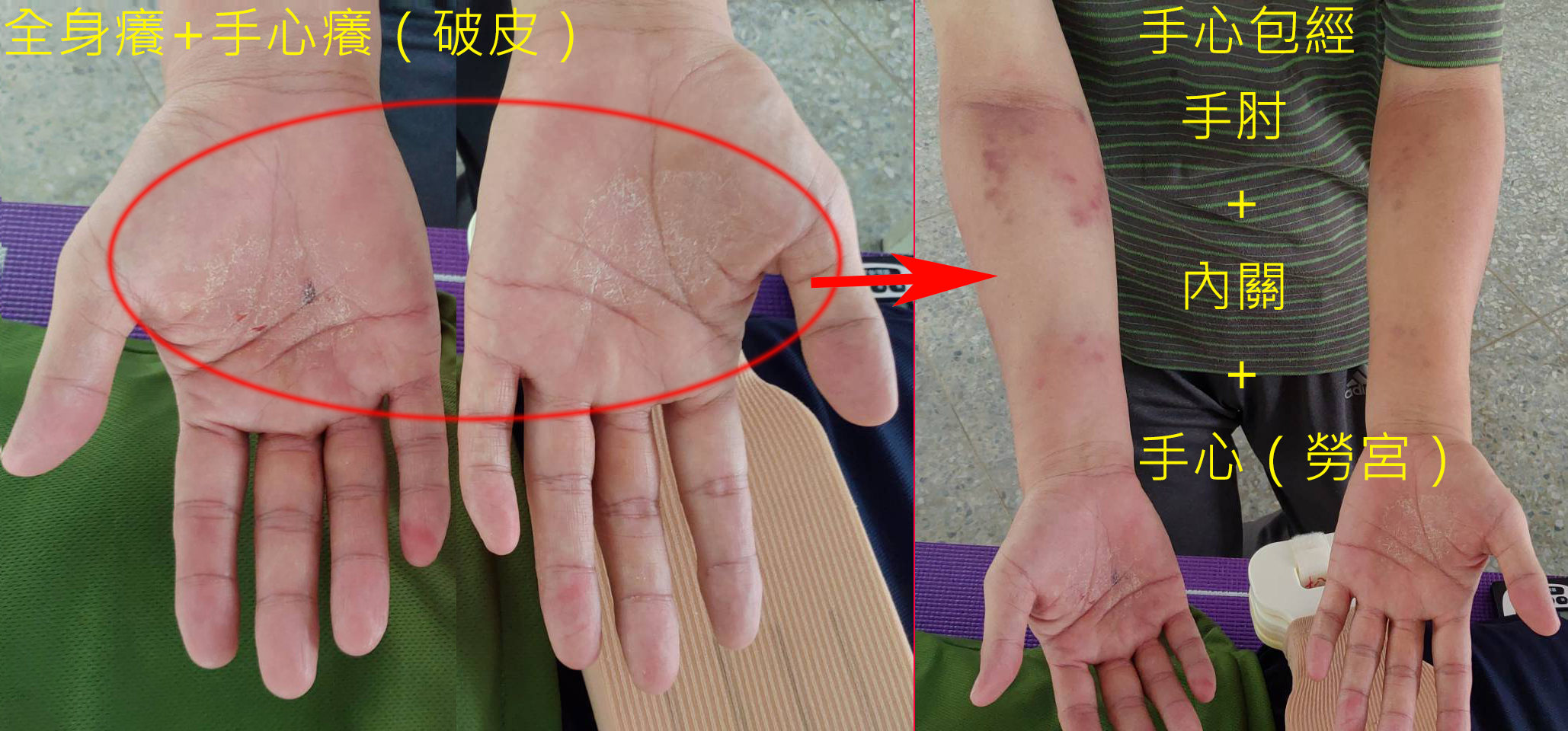 最後是手心,手心有心包經的勞宮穴,對有手汗的人是很有助益的,拍:8~10分鐘(以不痛為標準);
