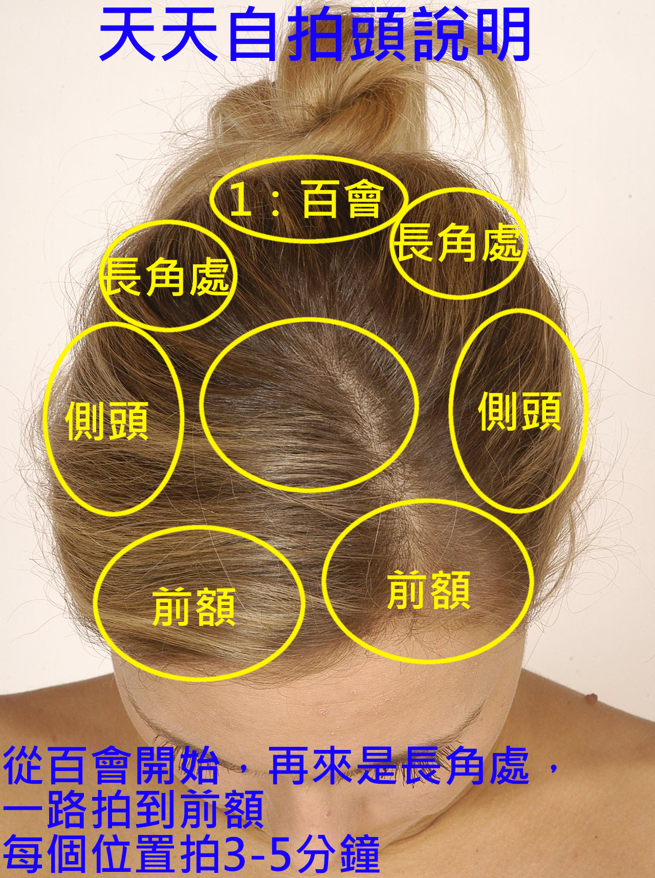自拍時,從百會開始,然後長角的部位,再來則是側邊,最後是前額;