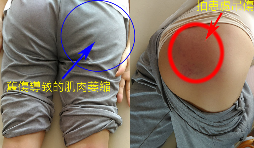 腿腳會無力,而手臂不會,則是屁股有舊傷導致的居多,需要在屁股找痛點,拍到不痛的程度。
