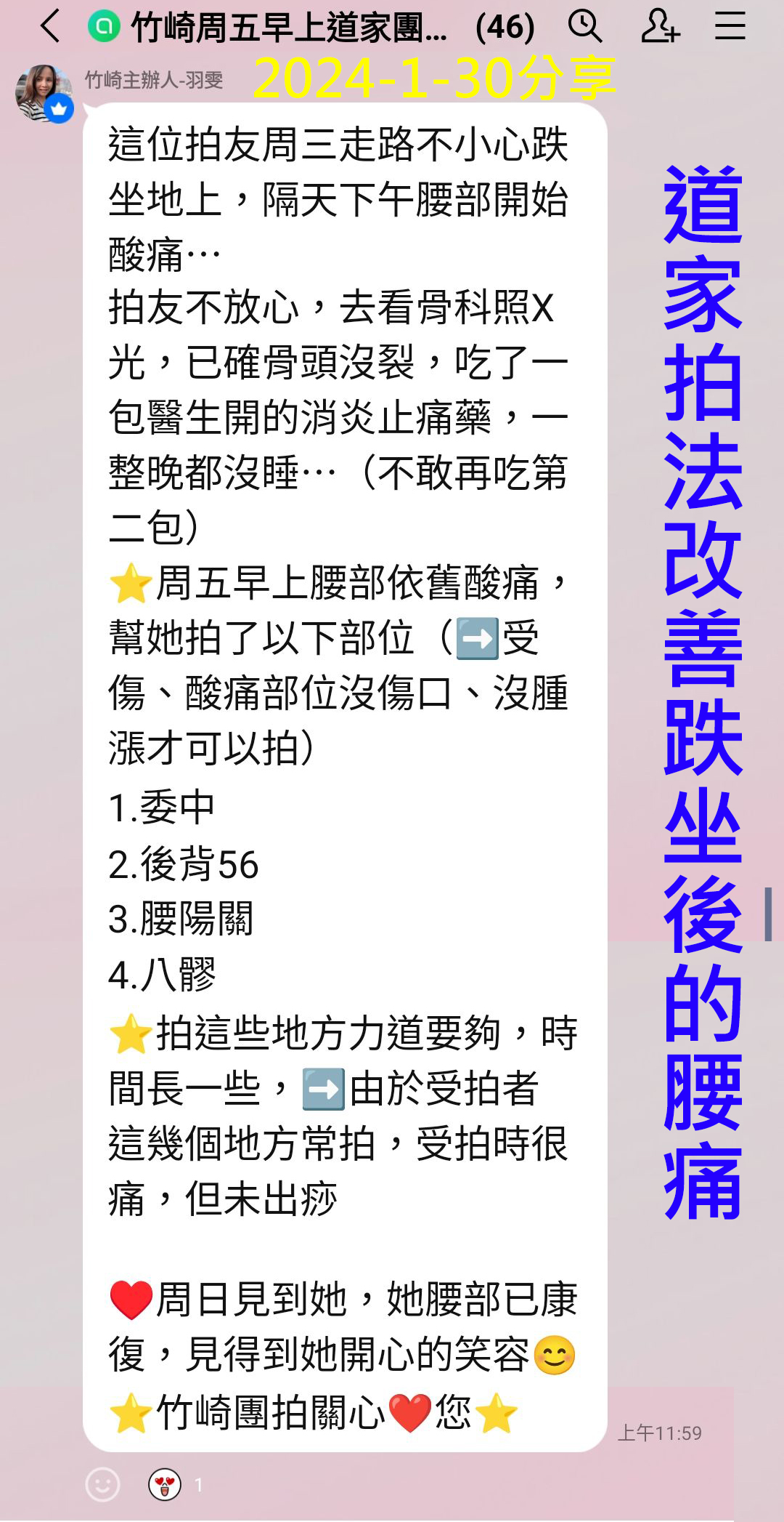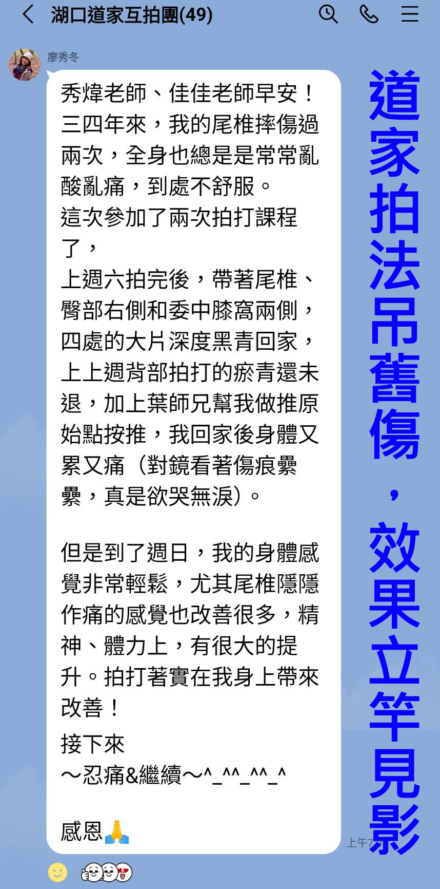 拍到背脊的傷處時,二側的位置,先拍個幾次,待拍到比較不痛時;
