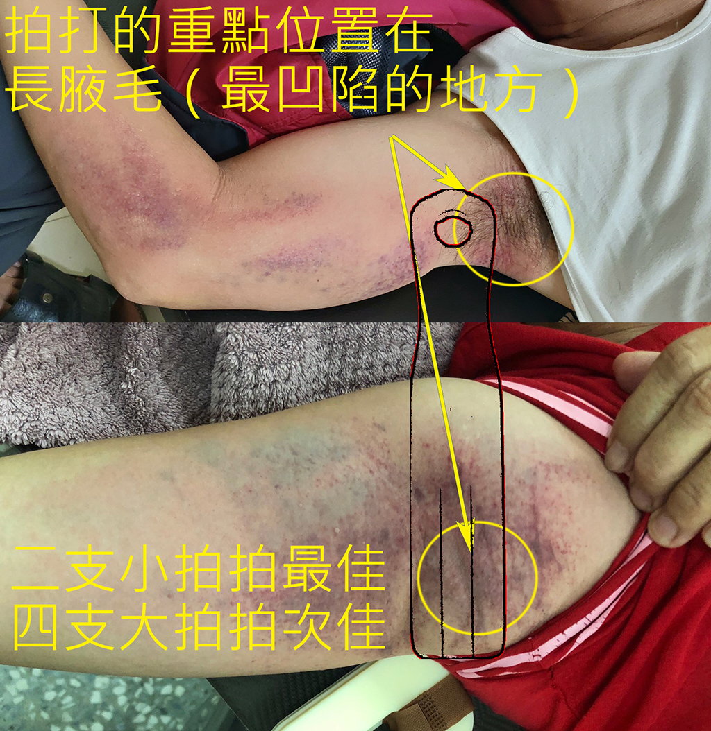 通常拍手肘時,手的肉不多,所以常用三疊拍拍打,自拍時則可以用小厚拍拍打